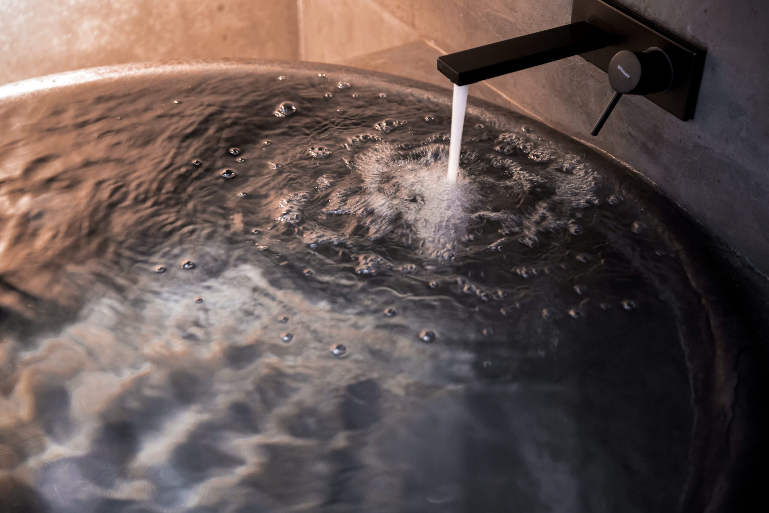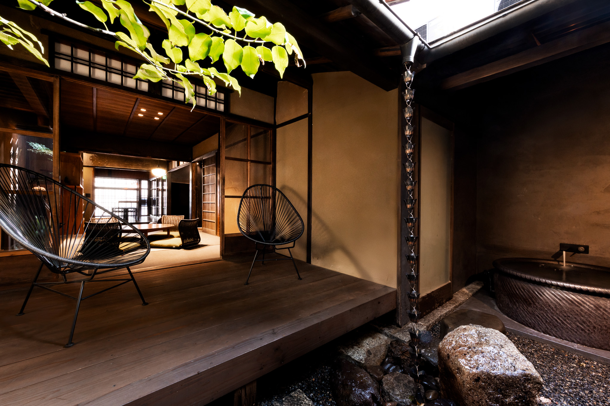 庭院内设有露天浴池。尽管地处京都中心地带,这里却是一个时光静谧流淌的空间,让您尽享远离尘嚣的惬意时光。