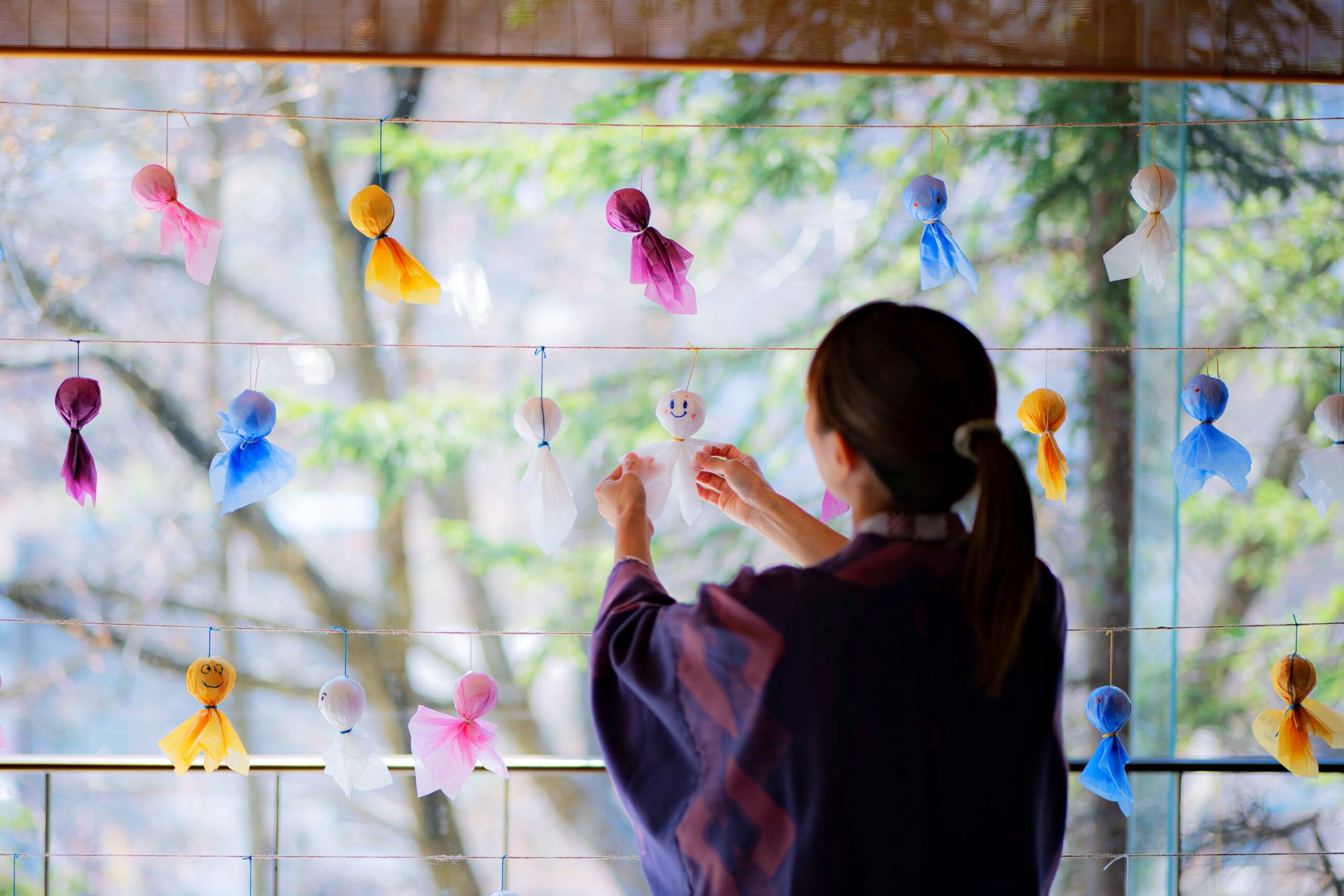 温泉と日本の文化を今に伝える宿「定山渓 鹿の湯・花もみじ」では、2025年5月12日~6月30日の期間、思い思いの願いをしたためたてるてる坊主を飾り付ける「願掛けてるてる坊主」を今年初めて開催します。