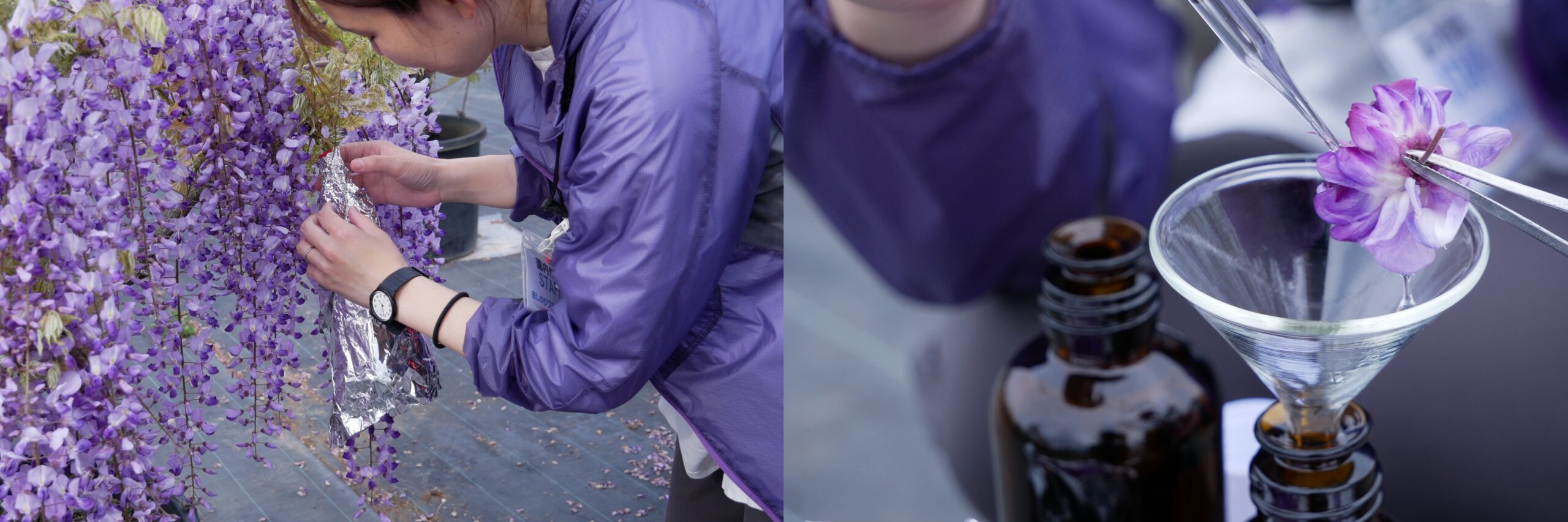 特に『奇蹟の大藤』では創業1808年、200年以上の歴史を持つ老舗香料メーカーである塩野香料(株)および(株)キチベエ協力のもと、実際に当園の大藤の香りを採取しリアルに再現しました。