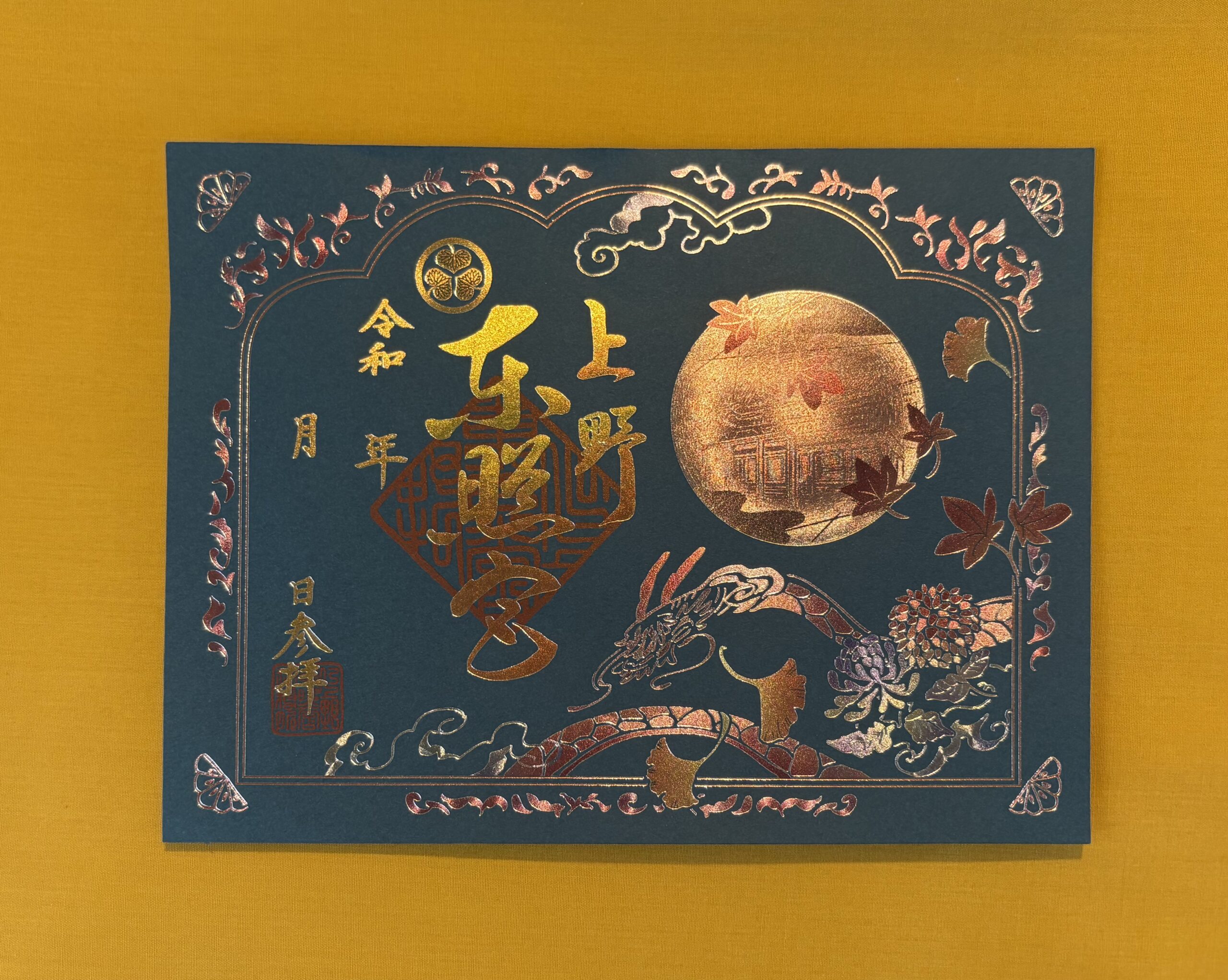 ライトアップ期間限定の「夢叶守」。星空と夜の社殿と、空を飛ぶ龍がモチーフです。この龍は上野東照宮の唐門(重要文化財)に左甚五郎が彫ったと伝わるもので、夜になると空を飛ぶ伝説があります。
