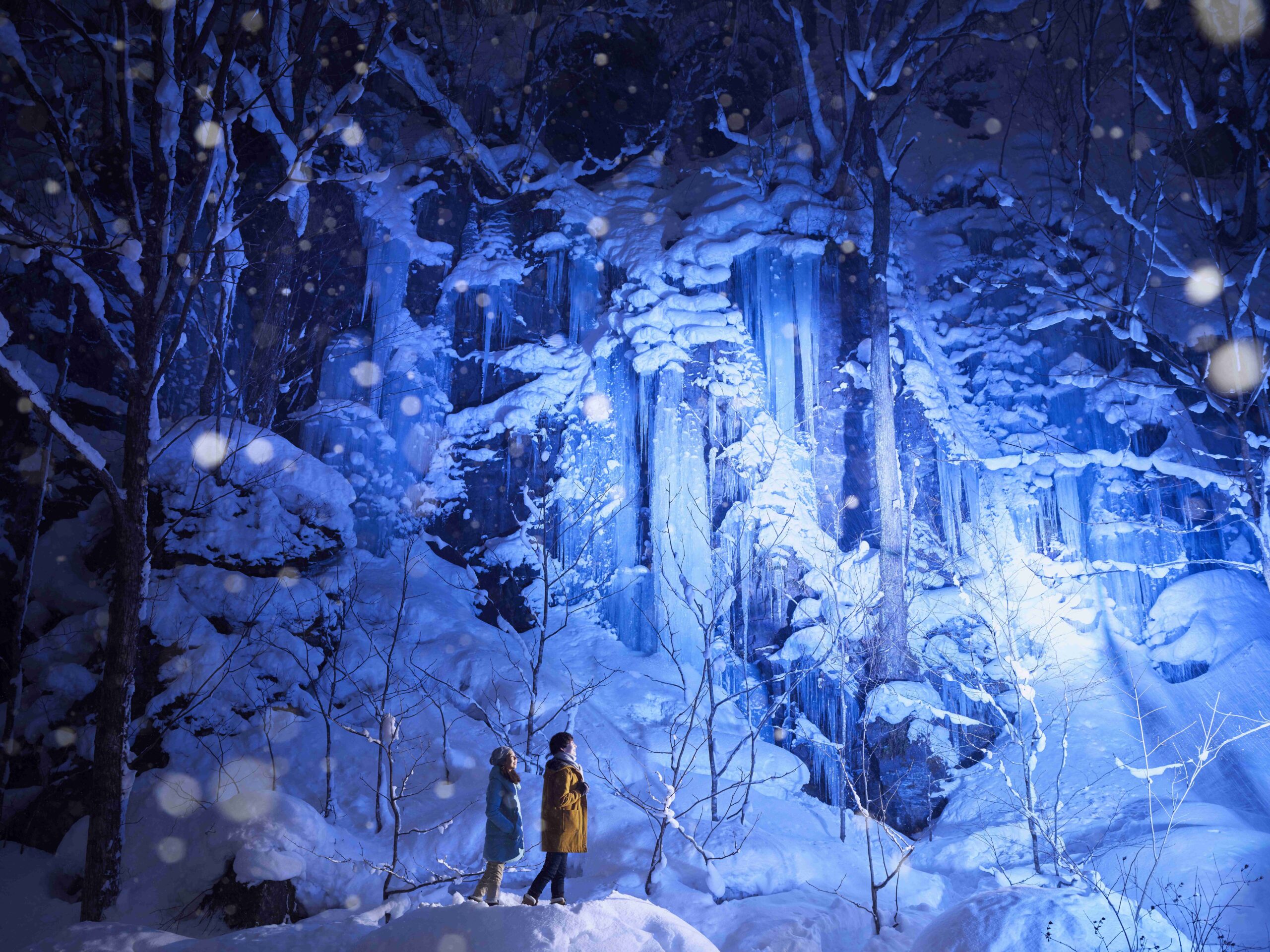 幻想的な夜の氷瀑で絶景を味わう「氷瀑ライトアップツアー」