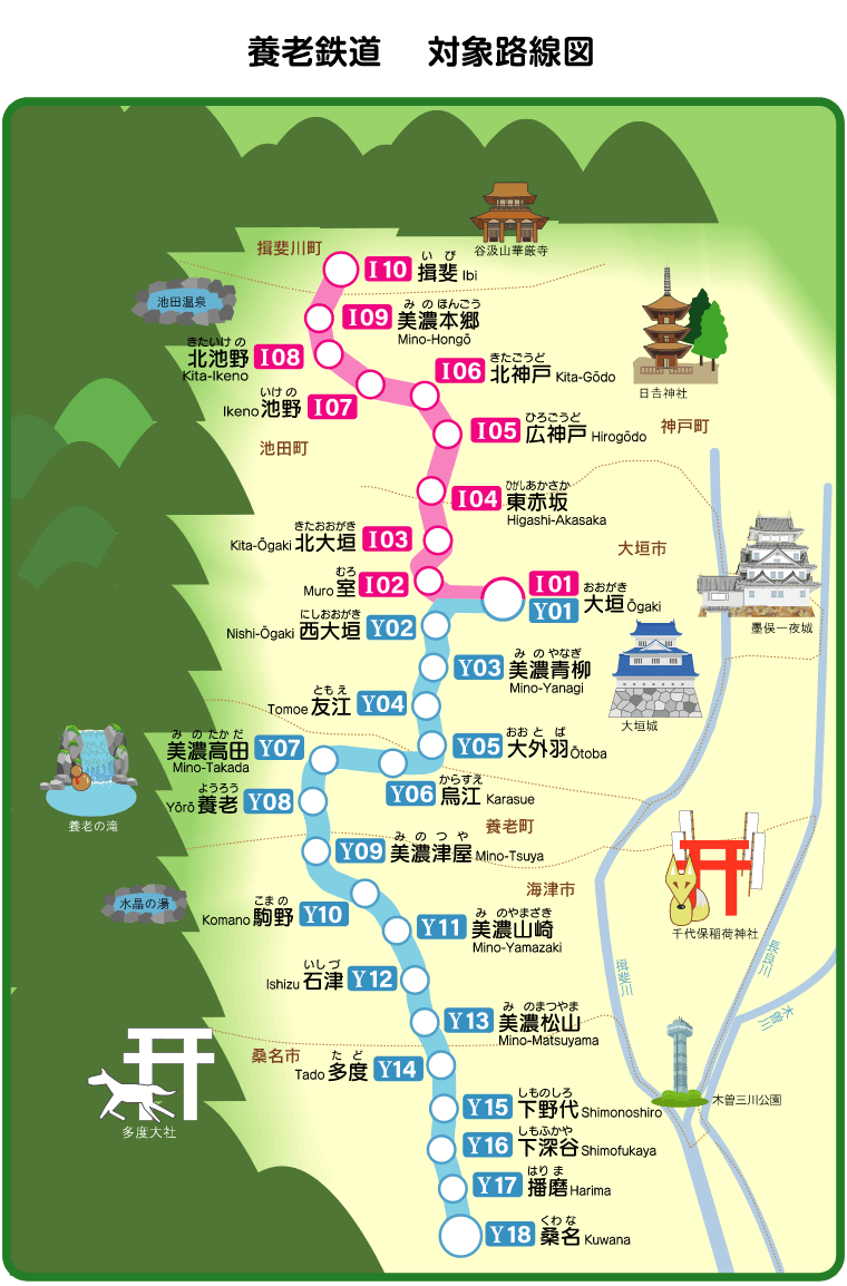 The Yoro Railway connects Kuwana City in Mie Prefecture with Ibigawa Town in Gifu Prefecture, with a variety of tourist attractions—including historical sites, natural scenery and hot springs—dotted along the route. On the Gifu side, visitors can enjoy walks and nature tourism at Yoro Park, which features Yoro Falls—one of the prefecture’s most famous waterfalls—and vast grounds where the natural beauty of the four seasons unfolds. On the Mie Prefecture side, there is Tado Shrine, famous for its ‘Ugemajinji’ ritual, as well as an area where streetscapes steeped in history remain, allowing visitors to spend a leisurely time.