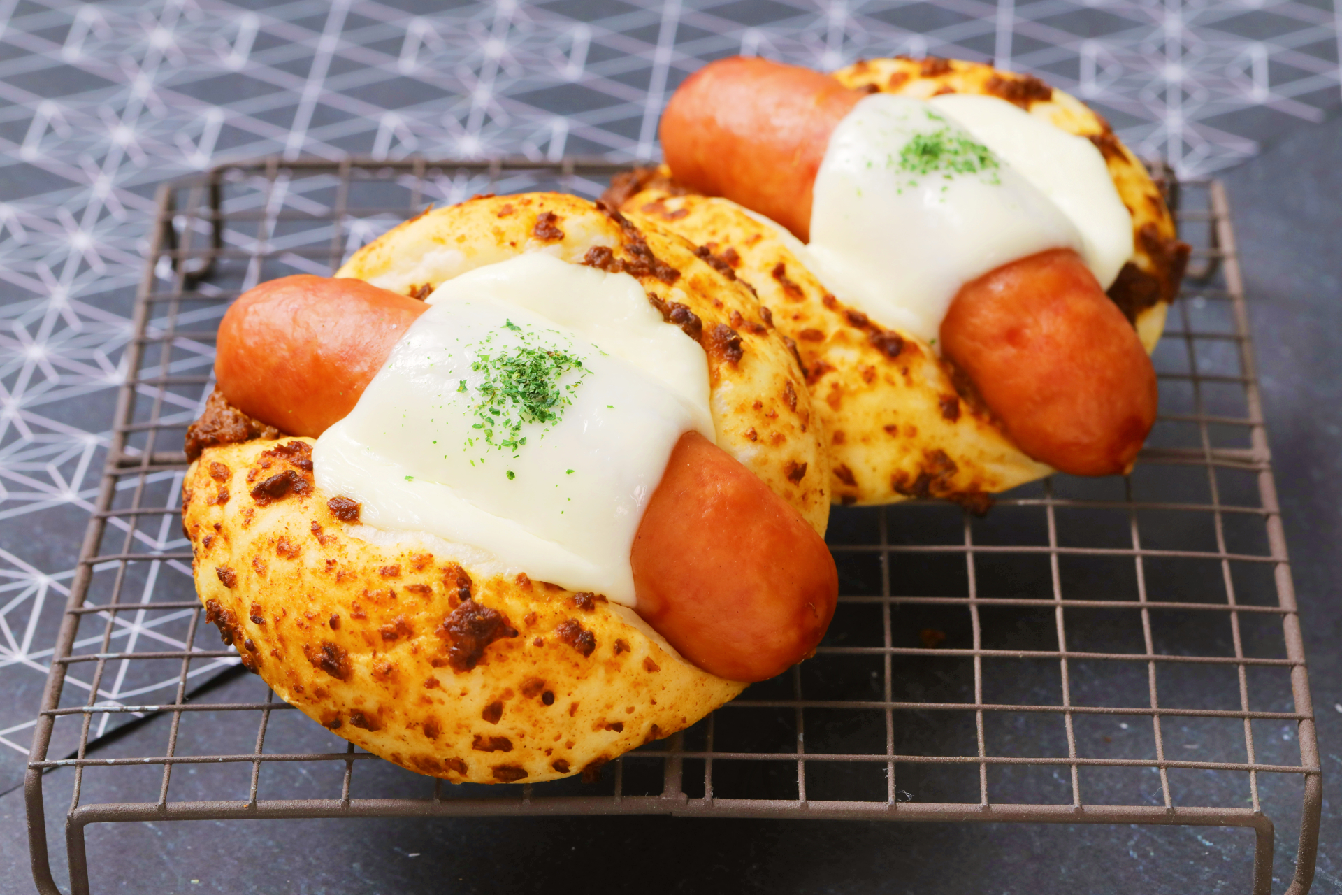 A chunky texture dough made from a unique blend of domestic rice flour and wheat flour, coated with keema curry and topped with a large frankfurter and cheese sauce, baked to perfection.