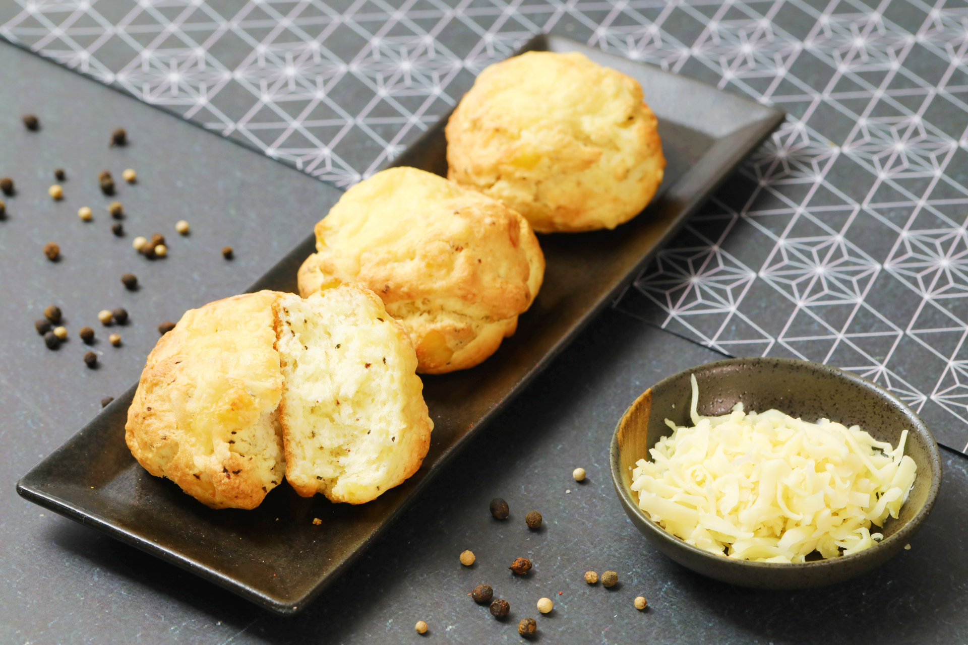 Savour the flavour of the ingredients in this savoury scone. Soft-tasting scone dough, baked with black pepper and diced cheese kneaded into the dough and topped with more cheese.