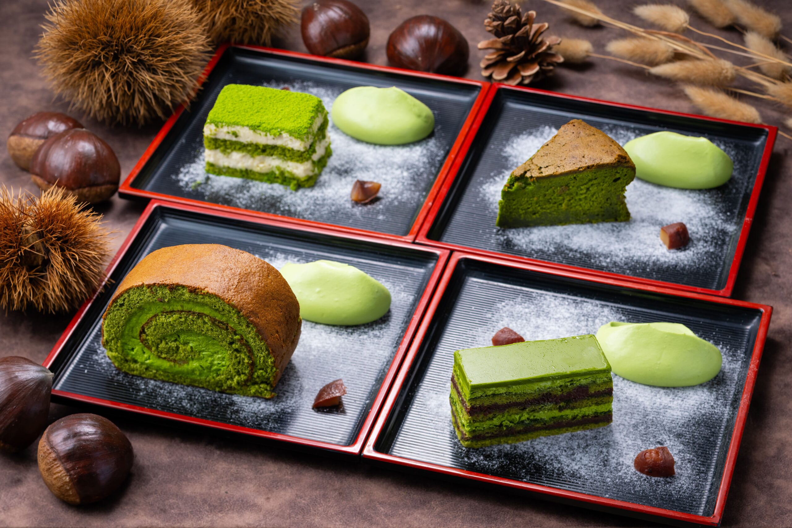 抹茶オペラ/抹茶ロールケーキ/抹茶ガトーショコラ/抹茶ティラミスからお好きなものをお選びください。また、さらに6種類のお茶はおかわり自由ですので、お客様お一人おひとりの好みに合った特別な時間をお楽しみください。