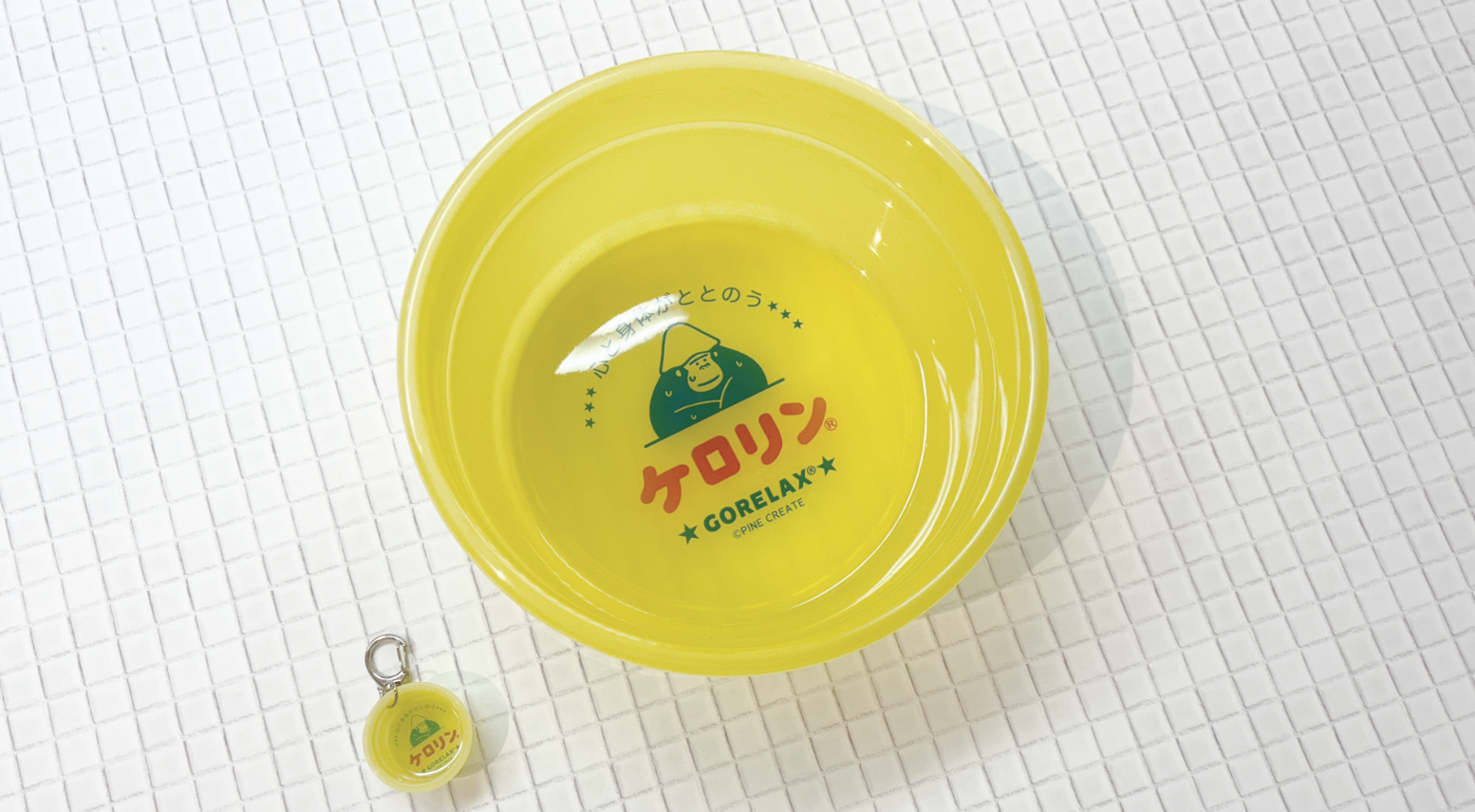 象徴的なケロリンのマークの中に整っているまもるさんのイラストが入ったオリジナルデザインで展開されています。お馴染みのイエローとまもるさんのキュートなイラストが見事にマッチしています。