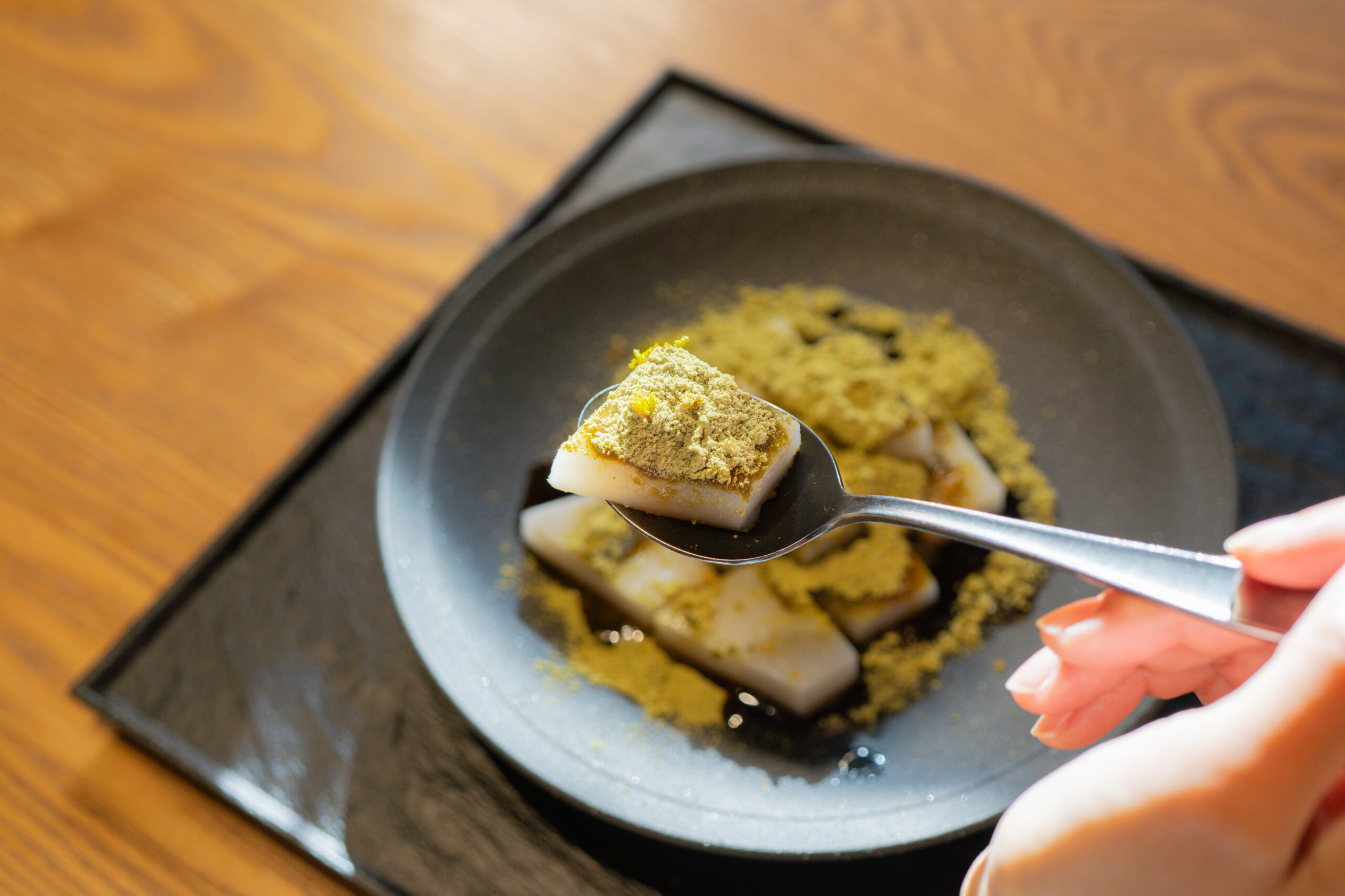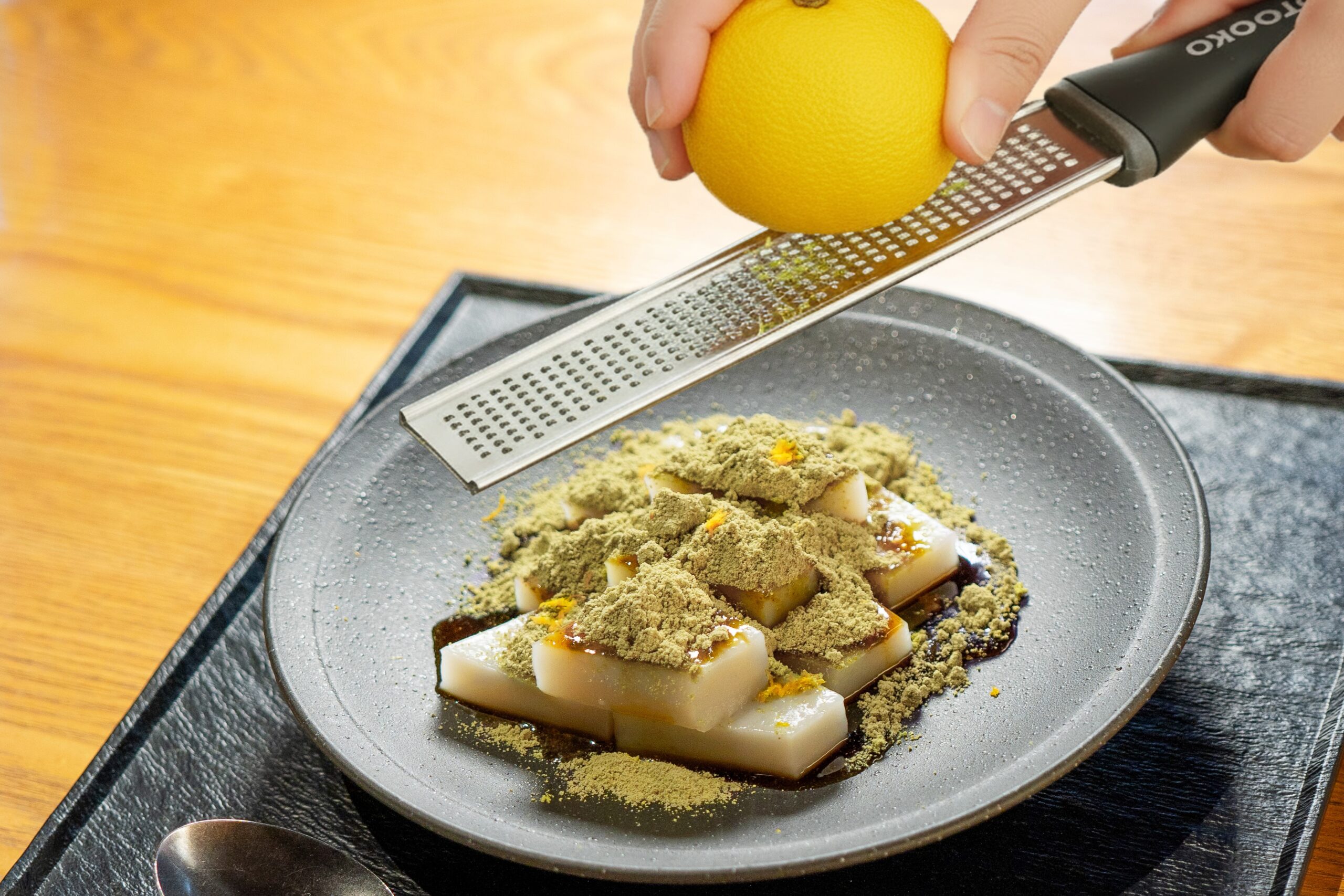 くず餅は、小麦でんぷんを450日間かけて乳酸菌発酵させた、もっちりとした独自の食感。通常は黒蜜ときな粉で提供していますが、本商品では宇治抹茶を使用した香り豊かな抹茶きな粉と黒蜜をかけ、仕上げに黄柚子の皮を散らしました。