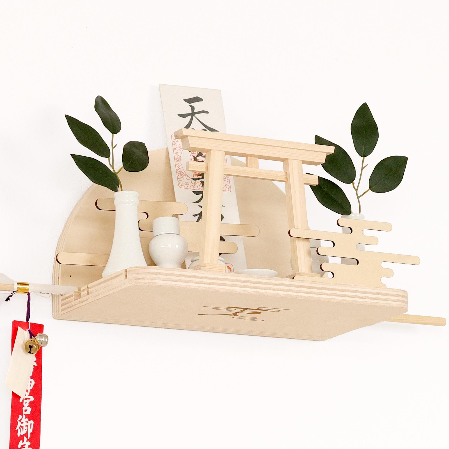 神具一式を乗せることができ、従来の神棚よりコンパクト・軽量に。しっかりとお札を飾れる、ちょうどいい大きさ。