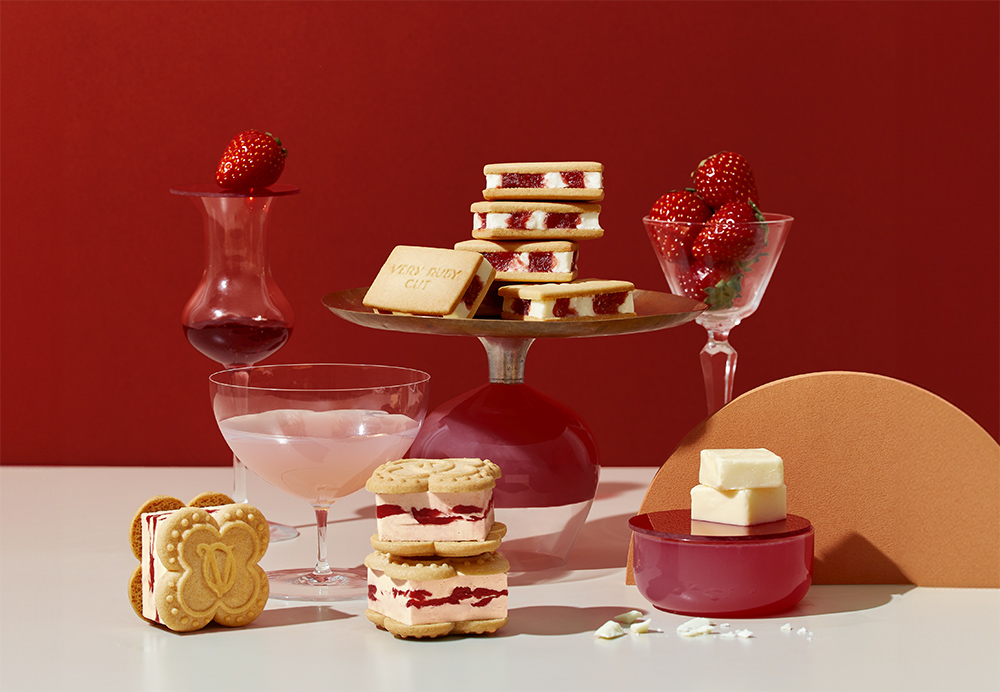 從「VERY RUBY CUT」必排隊的極厚『草莓奶油三明治』中,奶油霜也以多汁草莓為基底全新登場!選用香氣絕佳的「聖安德烈亞斯種」草莓,將果肉以草莓果泥慢煮製成草莓果醬果凍,完美呈現草莓原有的甘甜與酸味,搭配清爽的草莓鮮奶油霜。將雙重草莓美味攪拌成綿密質地,以散發發酵奶油香氣的餅乾夾入奢華厚實的夾心層。